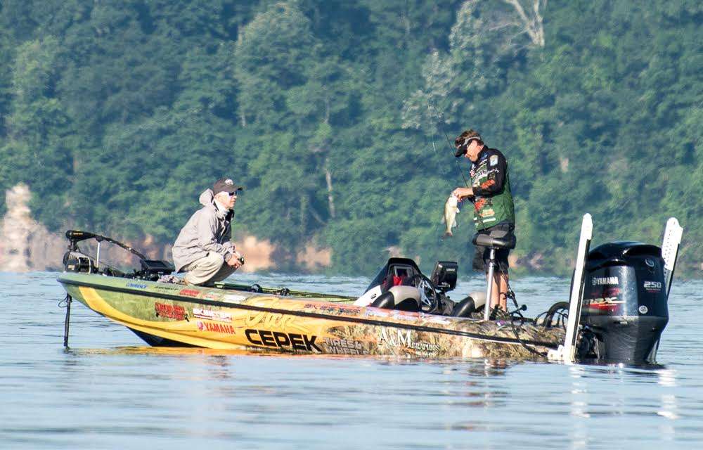 Pirch has definitely passed KVD, finding several good keepers while Kevin VanDam is still searching for his third fish. The two anglers continue to fish around each other, in a lazy dance south in the main channel of Kentucky Lake. I count 16 spectator boats fanned out in a half circle, all keeping a respectful distance from the two anglers.