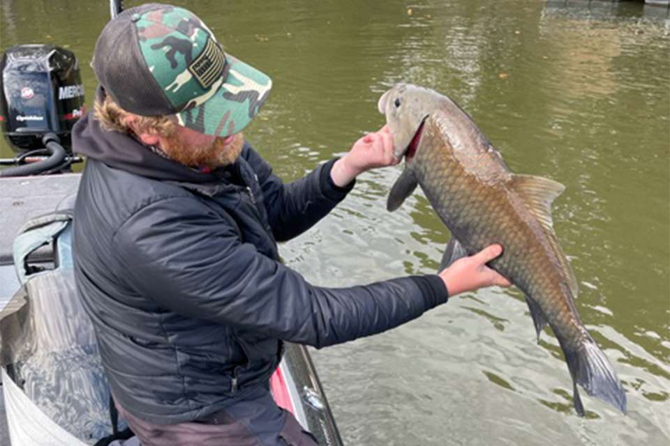 Dustin Wheeler boats a big one during pracitce for the Basspro.com Bassmaster Open at Grand Lake, but unfortunately it is the wrong species.