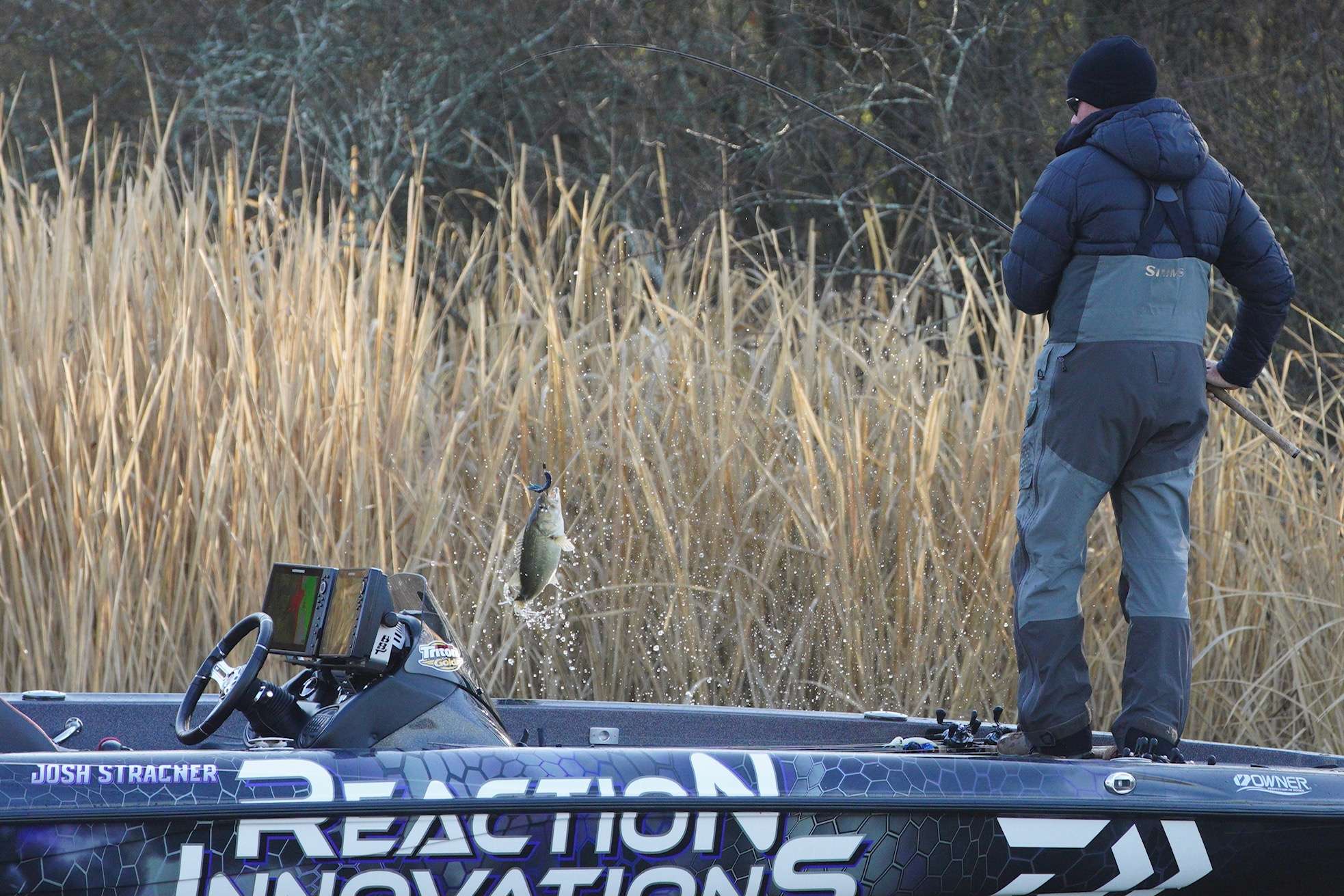 The Alabama native just boated his first keeper of the morning just moments ago. Stracner is fishing a small pocket just off the main river, just below Seven Mile Island. Utilizing a Texas rig and a jig, Stracner is methodically picking apart flooded reeds and isolated wood.
