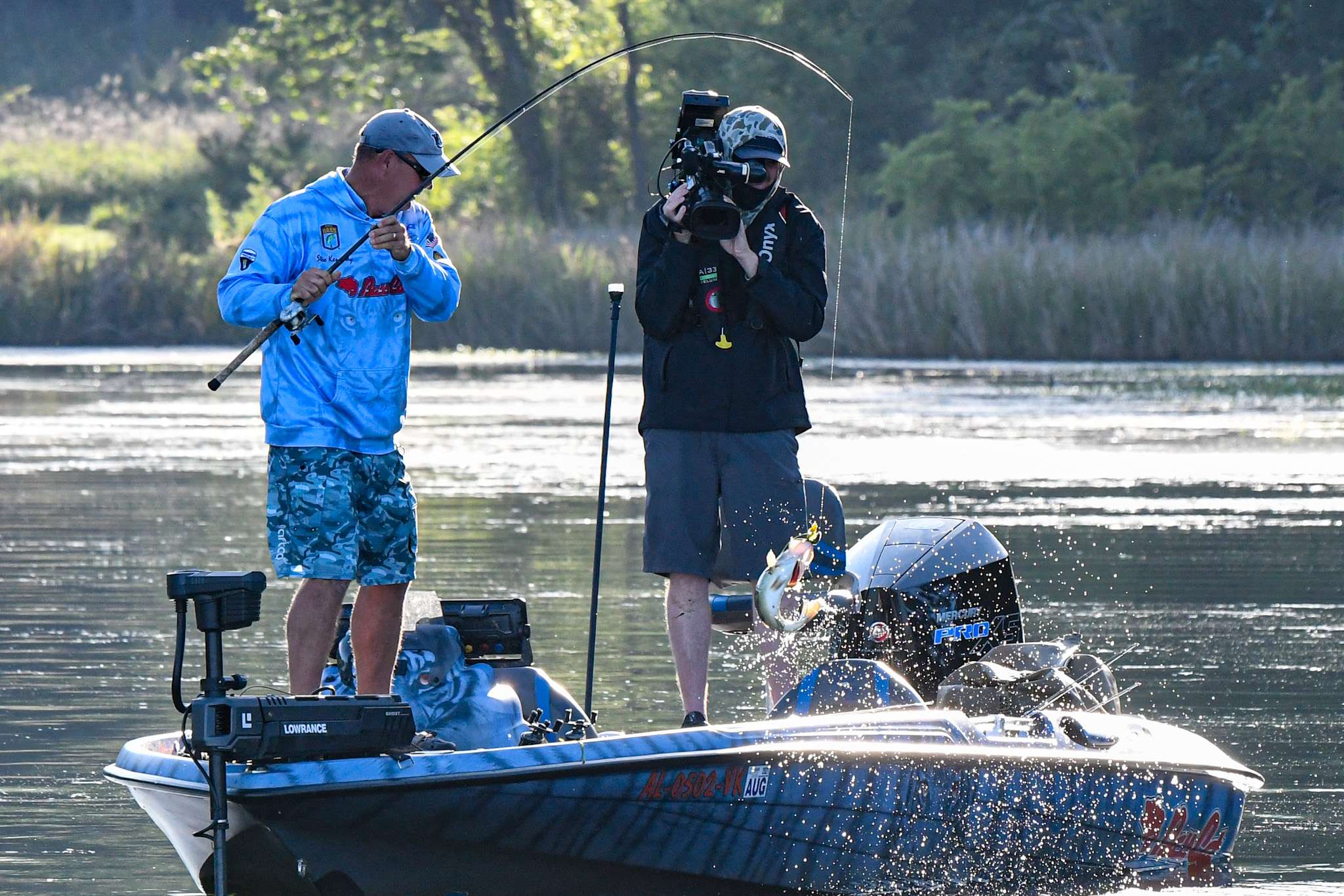 Steve Kennedy is fishing around a main river channel flat in 3 feet of water. The key draw is aquatic vegetation. That’s the setup he fished yesterday, using a glide bait. This morning, the glider is on the deck.
