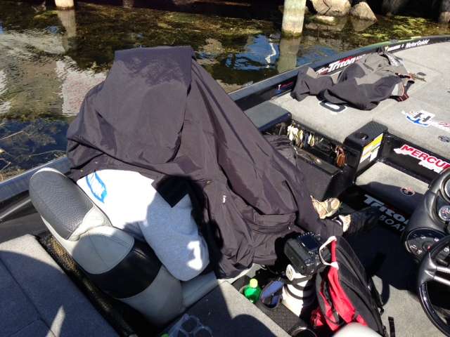 Under that black jacket is Steve Bowman, intrepid content man for Bassmaster.com. Cliff Pace rolled by and asked if he was taking a nap. A Spectator asked if he needed a private moment. Neither is right. Bowman is actually shielding himself from the bright sun in order to pick the best photos from today’s All Star action. Check back this afternoon for some great stuff!