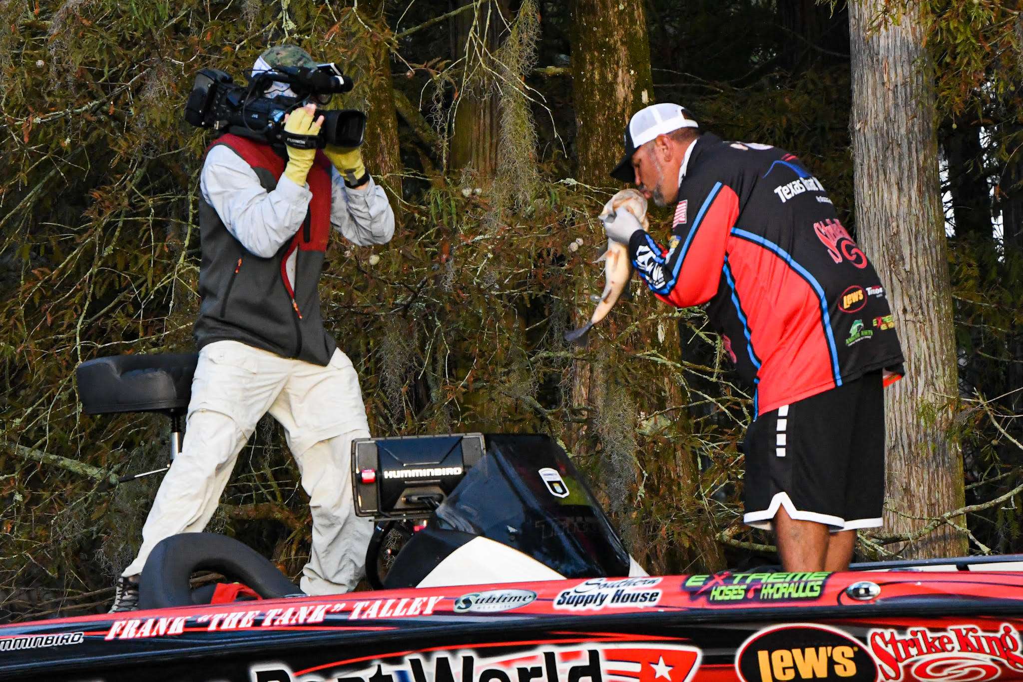 And sure enough, and just as planned, the fish bite his Strike King Thunder Cricket. Talley is casting the bait into the thick cypress that you see in the background, however the fish bite in open water.