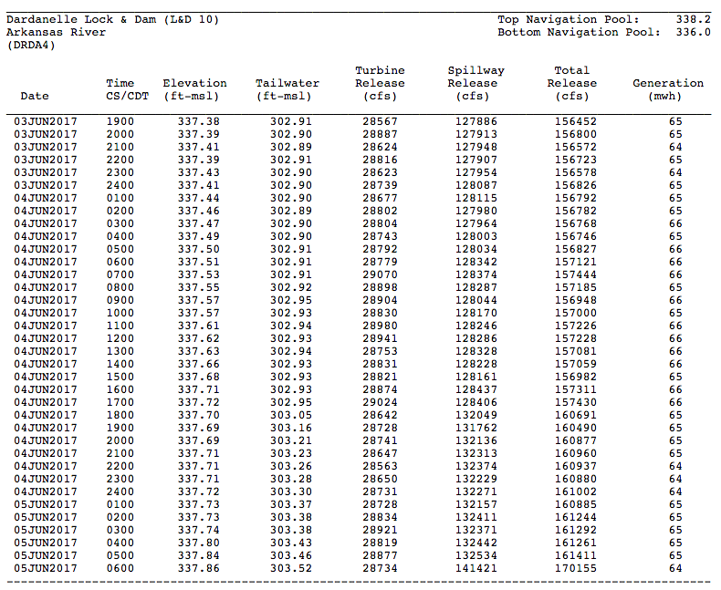 Many here were awakened by a cell phone flash flood warning early this morning, if they weren’t already up and at ’em on the final day at Lake Dardanelle. As you can see from the accompanying U.S. Army Corps of Engineers chart, the Arkansas River has been on the rise since midnight, when it was 337.72 feet above sea level. At 6 a.m. it was up to 337.86.