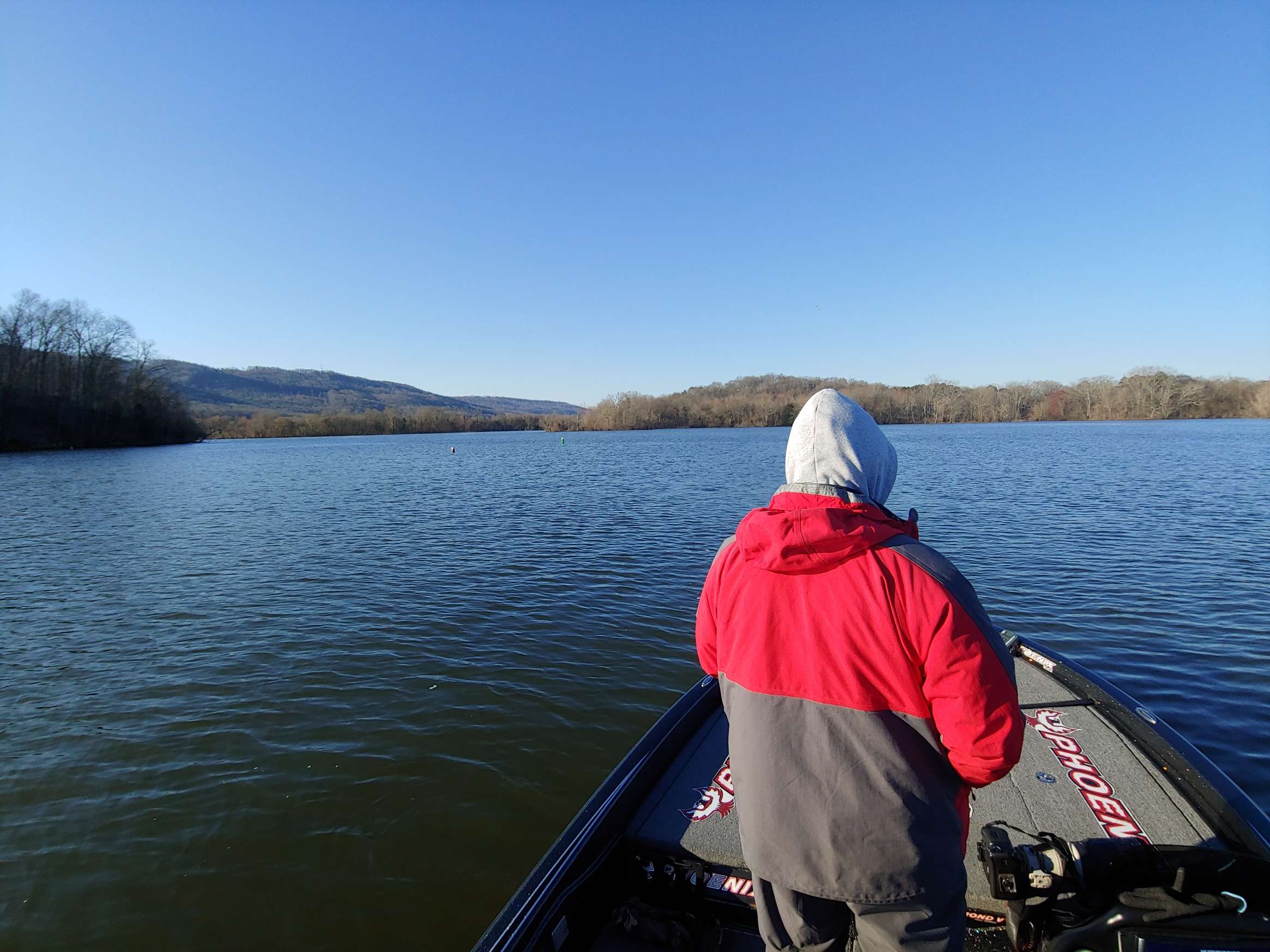 We have launched way up the lake and we’re waiting for Clent Davis to arrive. Bowman is tracking him, on the app, so we know he is close, but not yet in sight.