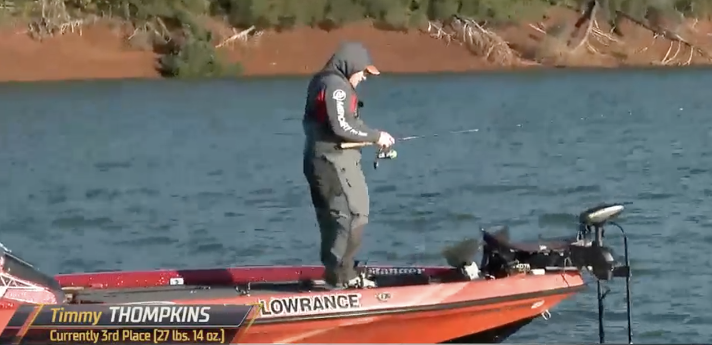 He’s trying to drift his bait just over the tops of these big rocks, but Thompkins noted that the wind is making it challenging to do so. He’s locked in on what he needs to do, so focus and consistency will be his allies.