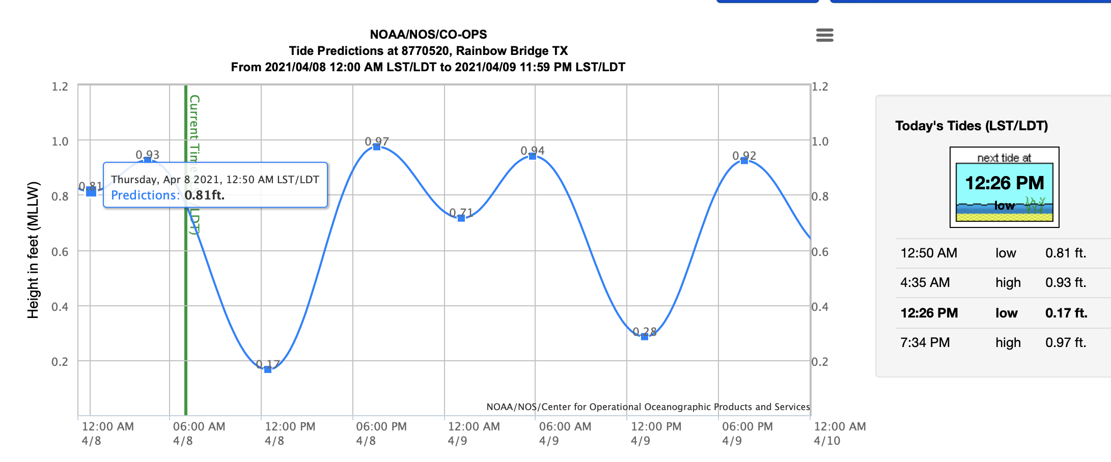 This is the tide chart for the area around Rainbow Bridge, which crosses over the entrance of the Neches River, near Bridge City. If you want a low tide, now is your time to capitalize on the opportunity.