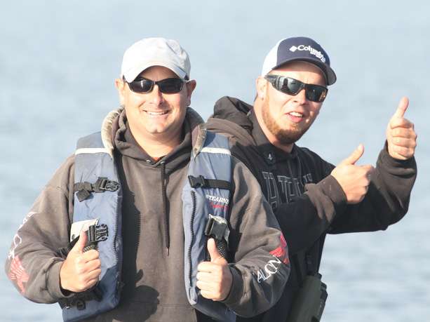 We're operating a bit short-handed. Our new bassin' buds aren't here. We met Blake Rambin and Trent James on the lake yesterday – two avid bass fishermen from Port Arthur, Texas, who had a day off and wanted to spend it watching the Elite Series pros. They volunteered to be an extra set of eyes for us in the limited visibility, and did a great job of calling and text messaging to let us know who-was-where and what they were catching.