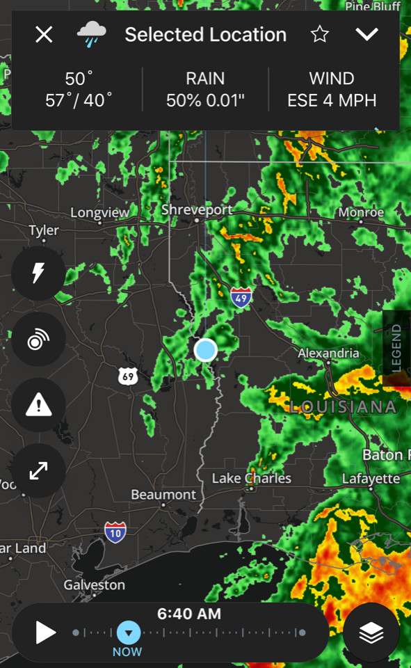 Day 1 of the Carhartt Bassmaster College Tour presented by Bass Pro Shops kicks off at Toledo Bend today. Cold temperatures, rain and wind have been the theme of practice this week, but that is supposed to stop soon. The last band of rain has hit Many, La. and should be gone by 10 a.m. CT.