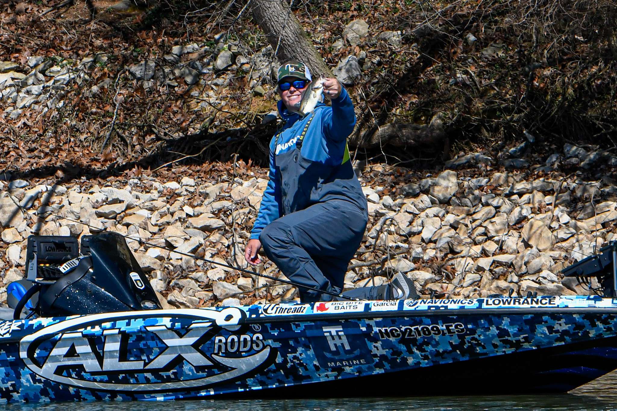 BassTrakk shows him in 12th place with 8 pounds, 15 ounces, based on the strength of fishing through a rotation of docks and sunny, rocky shorelines. The key attractant to his fish is the now 50-degree surface temp water. The bait, and bass, are coming up with the temp.