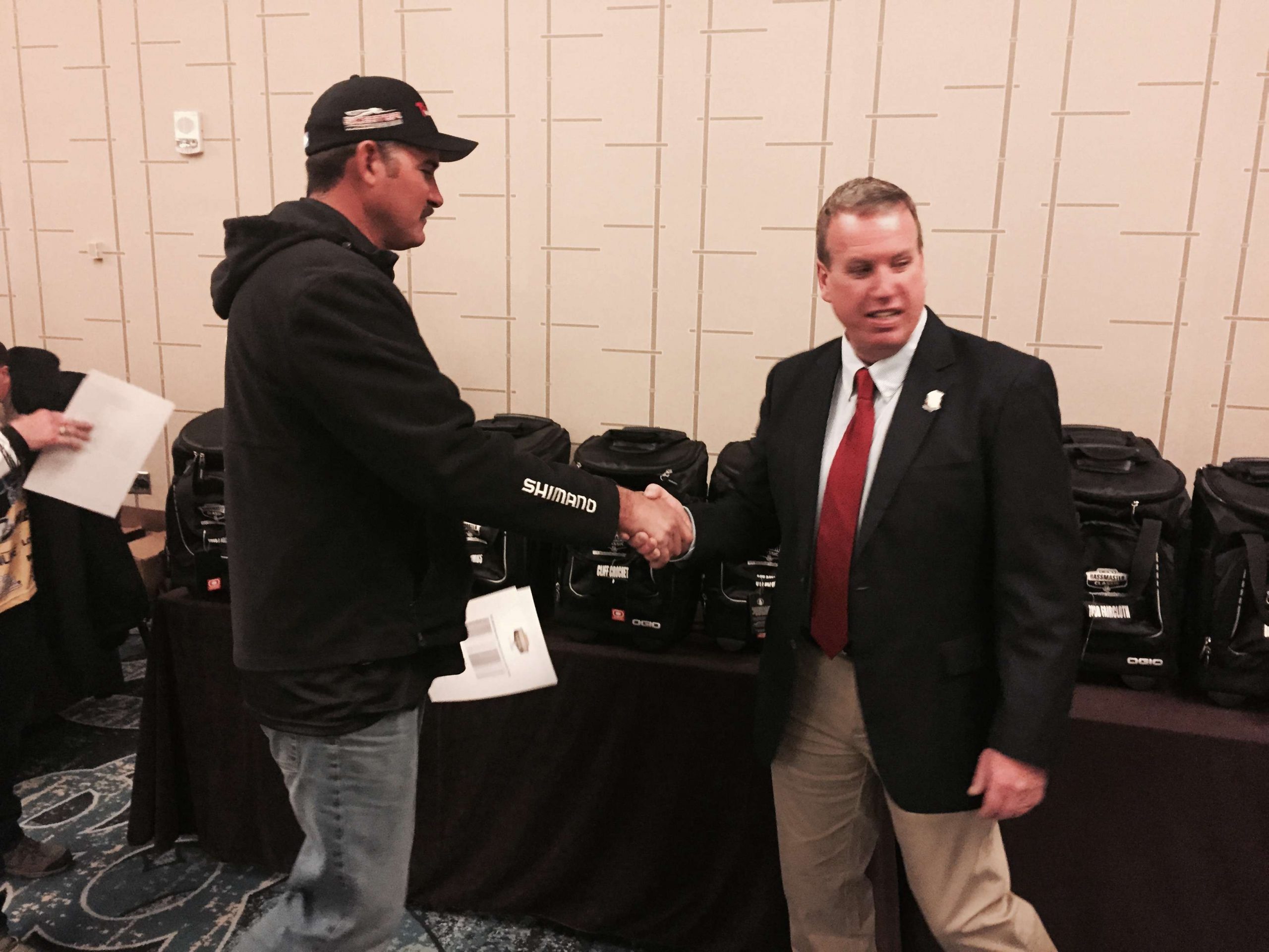 Indeed he does. The formal attire, at least for Bowes, was part of the welcoming festivities. The angler meeting takes place next. Our fashion police will be on the lookout to see if any other B.A.S.S. staff follow his stellar lead.