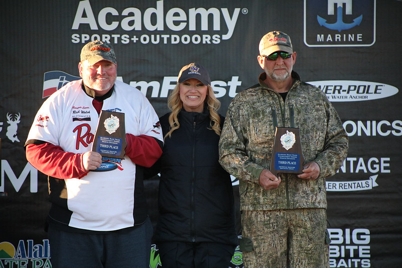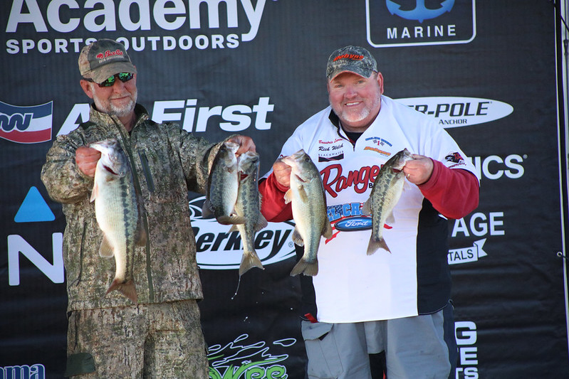 The third-place team of Kelly White and Rich Welch weighed in 14.53 pounds bouncing back after zeroing their first event. They spent three days of practice preparing for this event and planned to start in the back of a creek in the Duncan Bridge area. When they arrived, someone was already fishing that spot, so they decided to scramble and find another area settling on a shallow point with brush and gravel. In this area, they used a wacky rig and shaky head and caught a bunch of 13–16-inch slot limit fish they had to release. They realized there were a lot of fish in the area though.