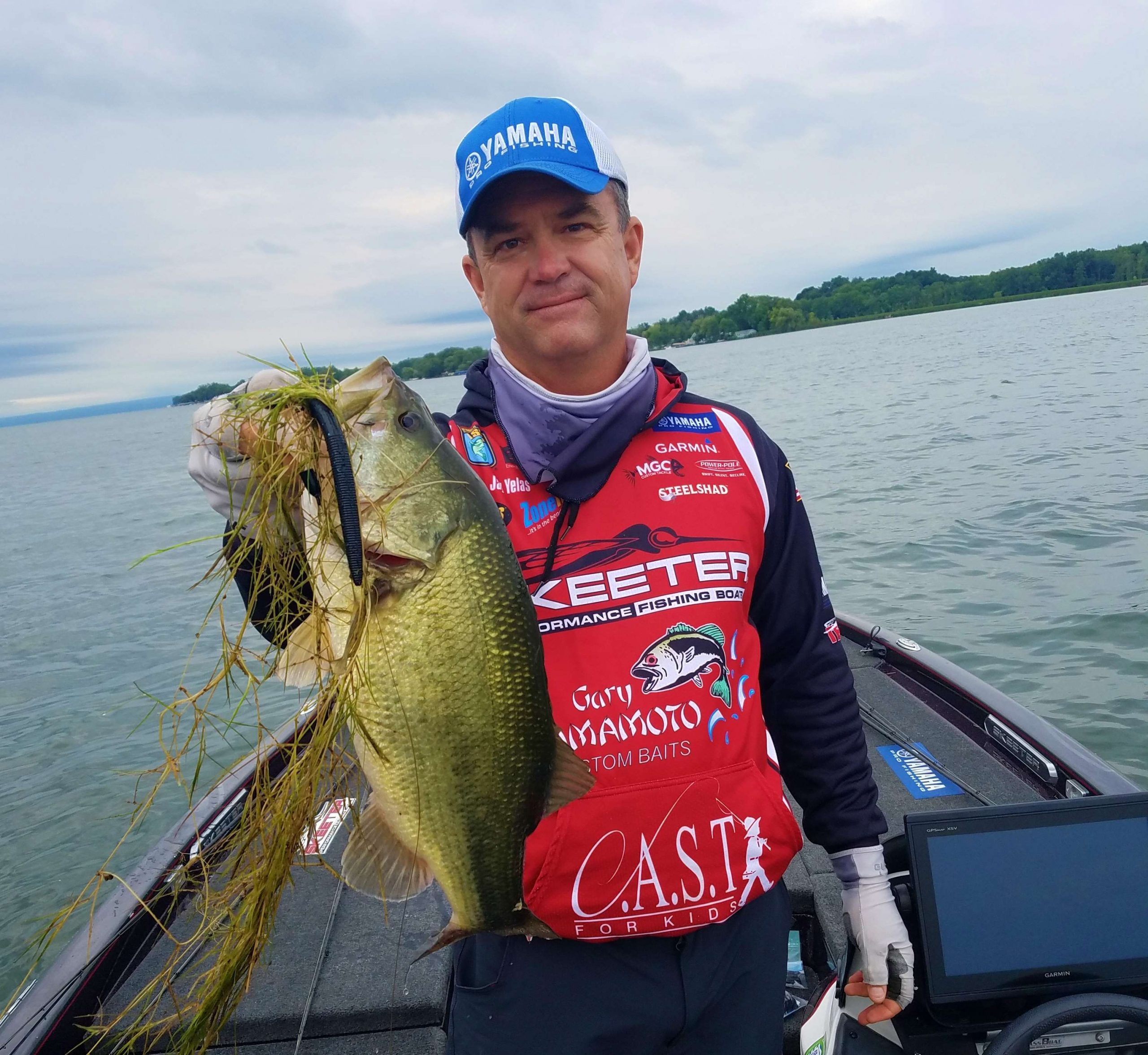 Yelas is holding up largemouth this week, like this 4-pounder caught early today. Obviously, the aquatic vegetation in Cayuga Lake is important in finding fish.