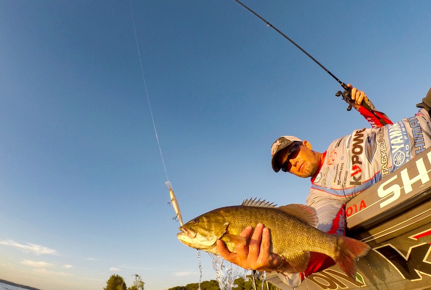 A lot of time we arrive at a new fishery and on the first day of practice the fish are biting like crazy. They haven’t been hammered by 100 top pros for days yet. Furthermore, it’s a weekday and the boat traffic is light. That’s when you can take out your core colors – like my trusty powder blue and chartreuse Strike King 6XD – and crush ‘em.