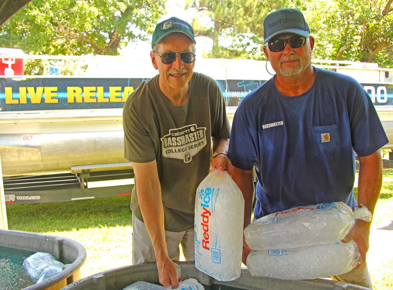 Not only do water temps need to be cooled in the dip tanks teams hold their bagged fish in as they make their way to the stage, but water must also be cooled in the B.A.S.S. Live Release pontoon boat tanks used to transport tournament caught bass back to the lake for release after they’ve been weighed in. And each pontoon boat can haul 600 pounds of bass at a time.