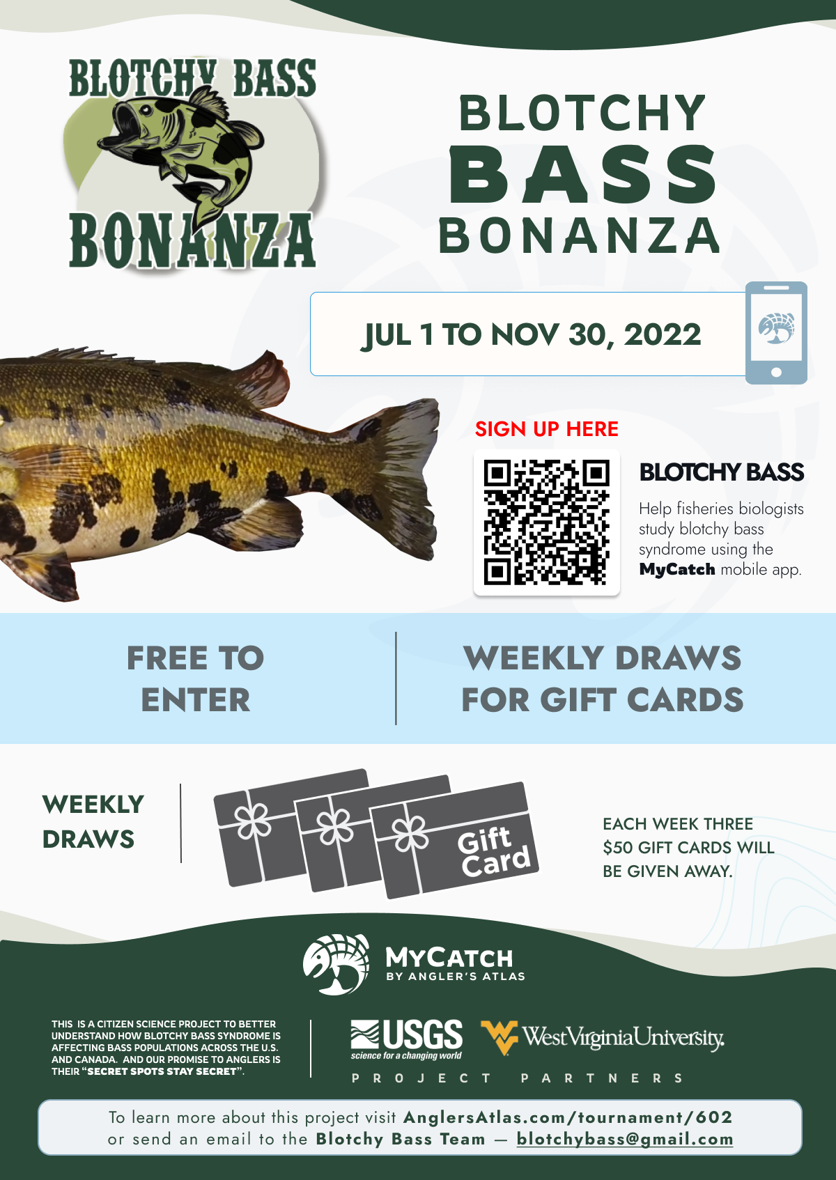 They ask anglers to report all bass they catch, blotchy or not, through the Angler’s Atlas website or app. The event runs from July 1, 2022 through Nov. 30, 2022, and participation is free. Prizes will be awarded weekly and monthly throughout the study. For more information about this research, click here. To sign up to participate, you can either scan the QR code in the poster in this email, or click here.