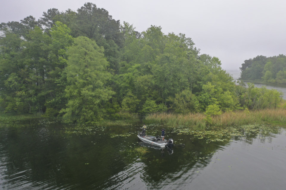 Drew Cook and Drew Benton are two of the few hopefuls looking to do well here exclusively targeting shallow bass on bed. Benton has ground his way to a small limit for 12 pounds, but he’s seen several good ones on bed he couldn’t get to bite. Drew Cook on the other hand just boated a 6-pounder to move into 13th. With only four fish so far, Cook has an estimated 15 pounds.