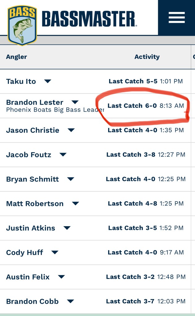 Interesting to note, Brandon Lester sits in 2nd and hasn’t made a cull since 8:13 AM. With a 2-10 in the box, that has to be more than a bit frustrating for Lester who could really improve his catch with another 4- pounder.