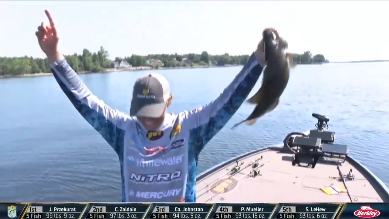 On Day 1 of the tournament, Przekurat had two small fish in the well mid-morning. He heard something off to his side and turned to see a 6-pound smallmouth chasing a minnow in the distance. He trolled over and his graph lit up with big ones by the bunches. This is where he’s done most of his damage now the last 4 days.