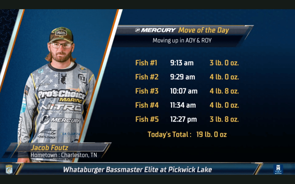 Jessie reported that he believes Foutz has been hanging around the same offshore hump all morning, having seen Foutz there earlier in the day while chasing down another angler. Foutz is doing the same thing we’re seeing other anglers do offshore, rotating through baits every 10 or 15 casts.