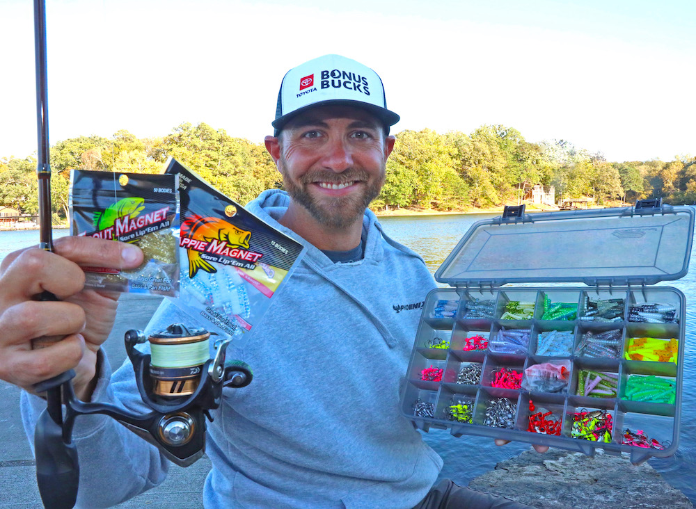 His No. 1 bait day-in-day-out is a 1.5-inch Crappie Magnet, on a 1/16-ounce Crappie Magnet jighead built with a razor-sharp Mustad hook, but on days when the bite is super finicky, he reaches for the even smaller Trout Magnet rigged on a 1/64-ounce jighead, to which he places a #5 split shot a few inches up the line.