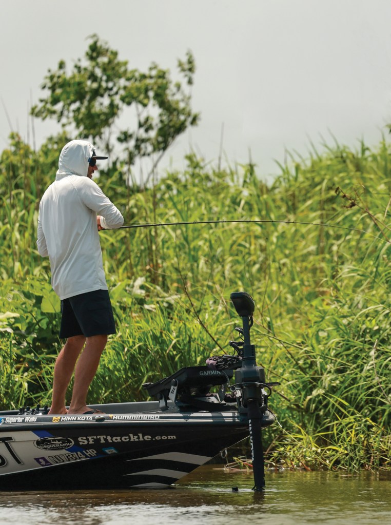 “I really fish it like a frog in a sense, where I want that bait basically on top of the surface or just below the surface, moving as much water as I can but in a quick manner,” he says. “You can also shake it on a slack line and keep it up in the water column with that trailer and keep it in that strike zone longer than you could with just a paddle tail on it.”