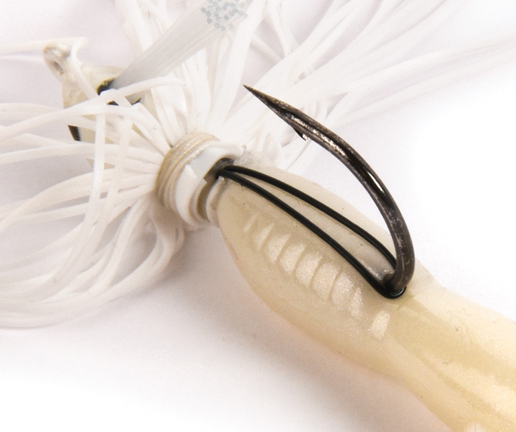 Kuphall pours his own swim jig, opting for a simple bullet-style head with a couple of upgrades: “I like to throw a very large hook,” he says. “A 5/0 294 Gamakatsu is what I generally put in it.” He also cuts off the rear part of the lead keeper barb, opting instead for a custom loop keeper made of a heavy rubber strand (the kind used for bead necklaces) to hold his trailer in place.