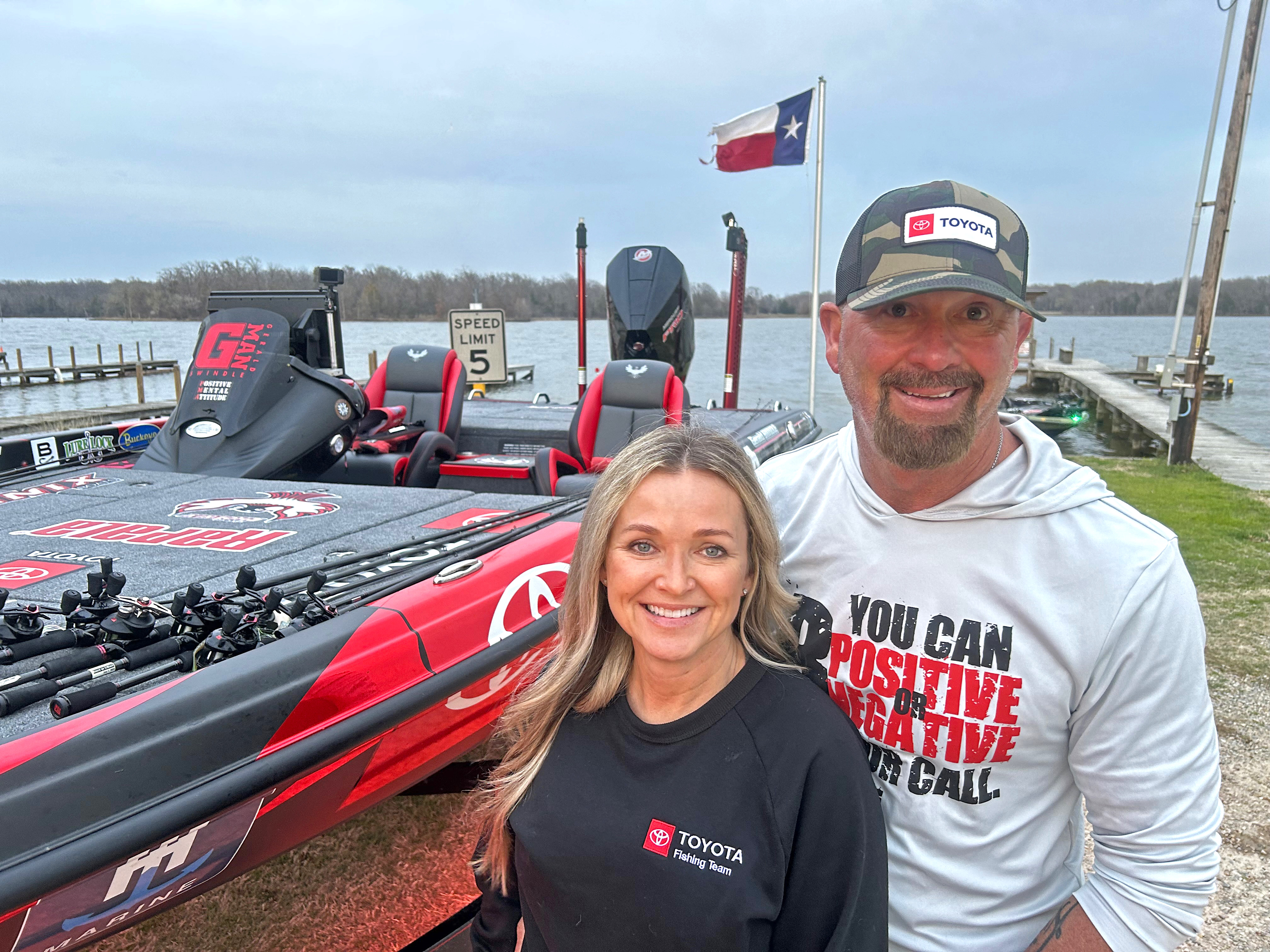 Team Toyota’s Gerald Swindle returned to the boat ramp Tuesday evening at Lake Fork following another long day of practice with a torn-up transducer and healthy heart for the woman he loves.