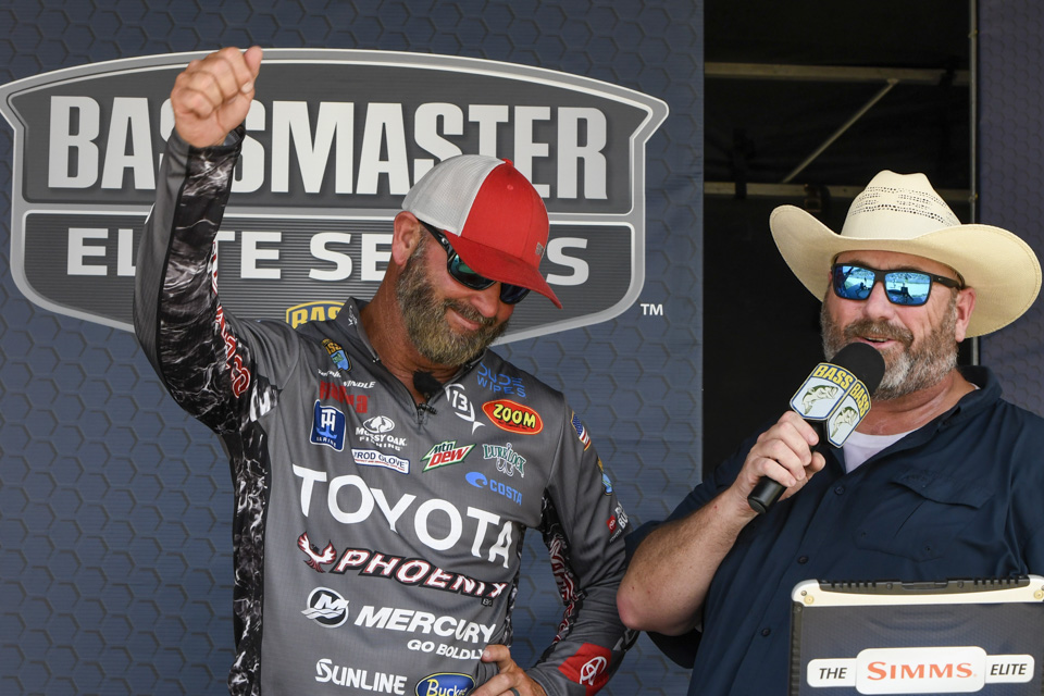 At the Semi-final Saturday weigh-ins, Bassmaster Emcee Dave Mercer asked Swindle about the possibility of notching his first Elite win.