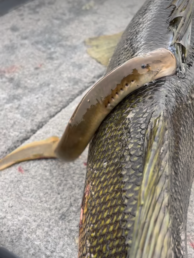 … as his latest catch came with a tag-along lamprey.