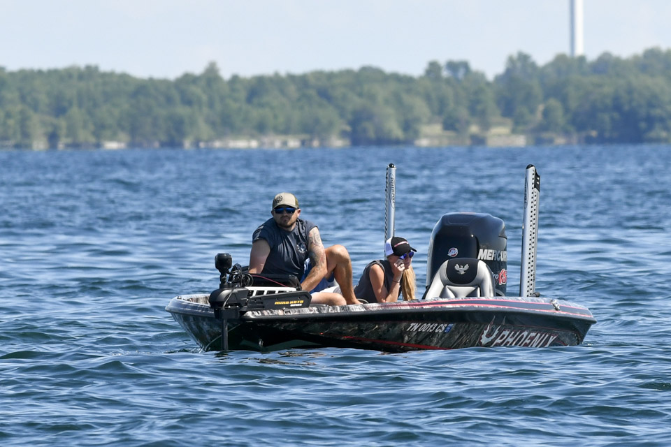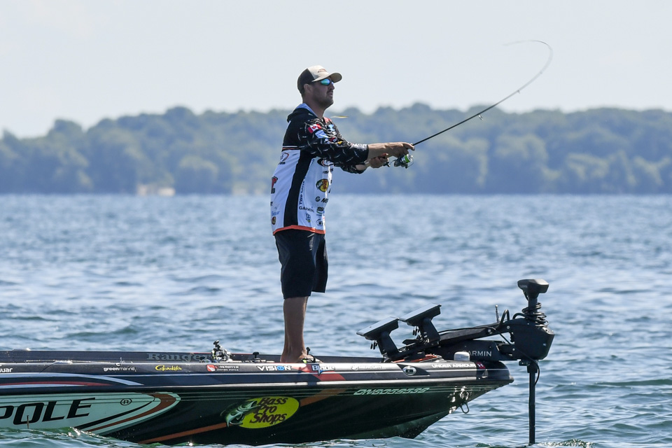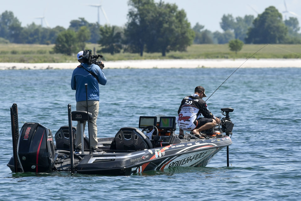 Several moves after we caught up with Johnston, the angler set the hook and began fighting another bass to the boat.