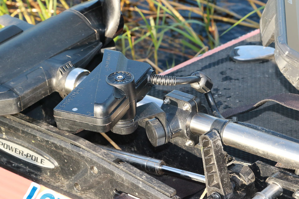 The shaft of Lane’s trolling motor holds the Lowrance ActiveTarget unit.