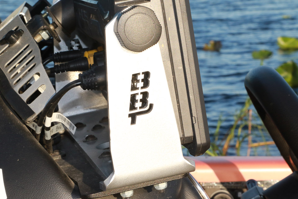 A Bass Boat Technologies mount holds his console units.