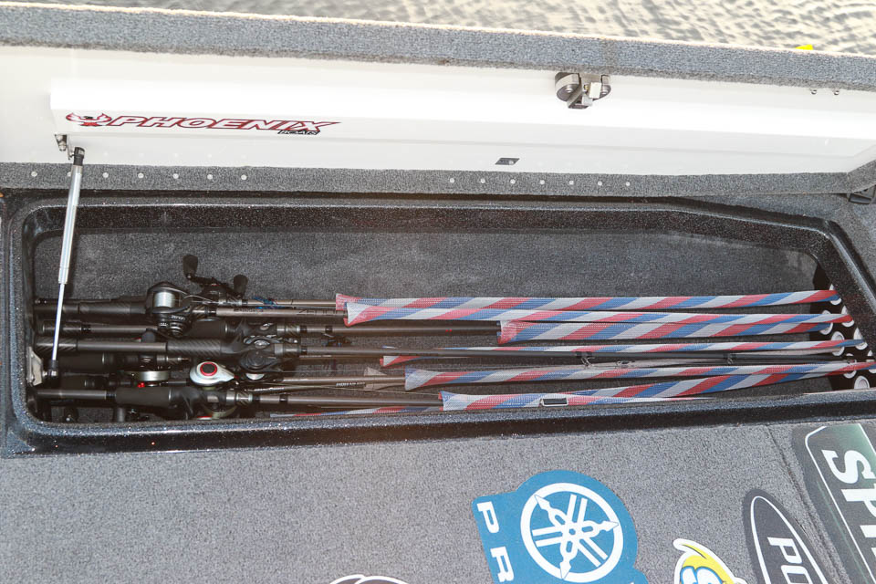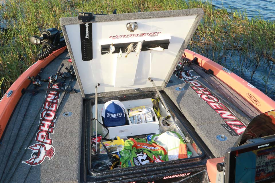Lane’s center box holds an assortment of hard baits and soft plastics, along with his tournament jersey.