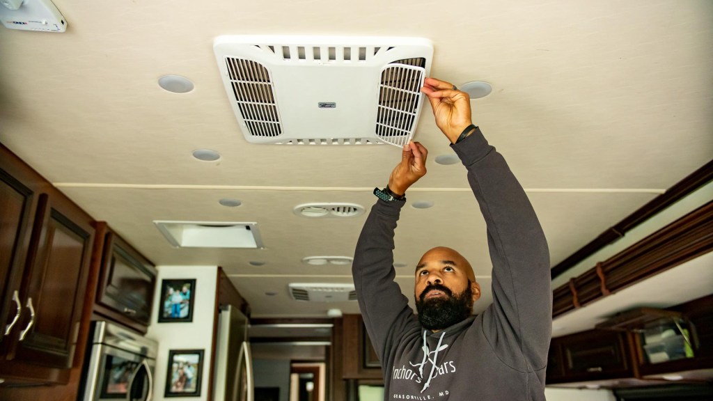 The last thing you want to deal with in the heat of summer is an issue with your AC units not performing well, or at all! Fortunately, keeping them clean is a relatively easy process. The filters are located on the inside of the RV on the part of the AC unit that you see on the ceiling. The filters are located behind the plastic grates that simply pop off. Take the filters and wash them with warm water and mild dish detergent until they are clean. Let them dry thoroughly and then place them back in the AC unit. If there are any tears or damage, it’s probably best to replace the filters. Cleaning intervals will vary depending on how often you use your RV. For us as full-timers, we clean them monthly. You’ll also want to clean dust and debris off the compressor coils/heat exchangers on the outside of the unit. On the roof, remove the shroud from the AC unit and use compressed air to blow out the accumulated dust. This should be done about once a year. And while you’re at it, clean the screens on your vent fans, too.