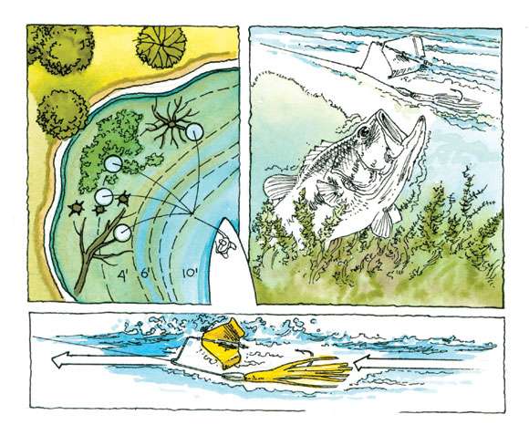 Schultz's technique is simple: "I'll pick out targets and blaze that bait by them. I'll cast the buzzbait past my target zone and reel it back through it as fast as I can. I'll hold the rod tip high and engage the reel and start reeling the instant the bait hits the water," he describes.