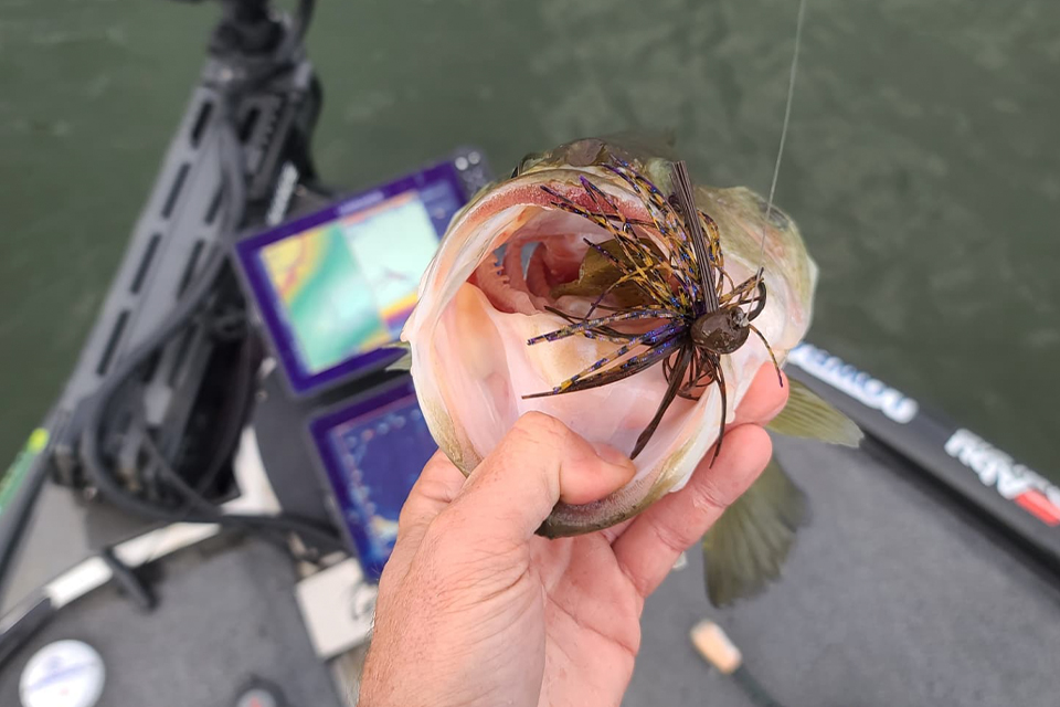 “I always try to use a 1/2-ounce football jig, unless I’m having trouble keeping it on the bottom. The reason being, fish are easier to hook on a 1/2 than a 3/4. A 3/4 is a big, big head, and when you set the hook, deep especially, you’ll knock their mouths open and have a hard time hooking them.”