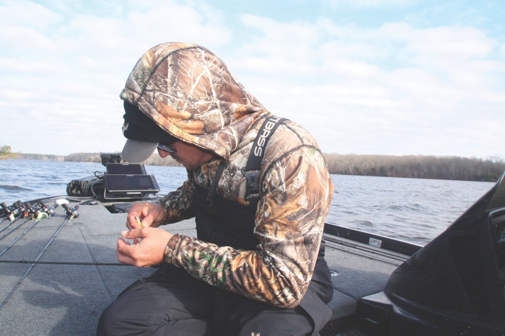 9:48 a.m. Atkins pauses to replace the stock hooks on his jerkbait with heavier trebles, “so I can cast it farther into the wind and get it down a little deeper.”