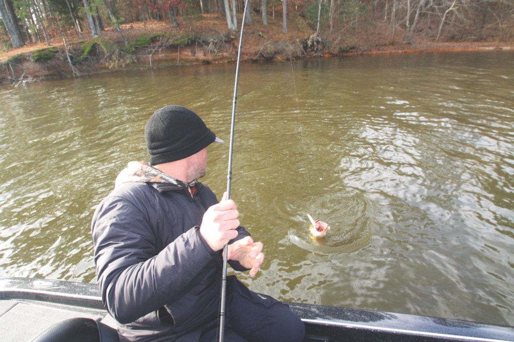 10:06 a.m. Atkins is wind-drifting uplake while jerkbaiting primary and secondary points. What’s his take on the day so far? “It seems like the fish are in a transitional phase between fall and winter; the fish I’ve encountered are mainly suspending up high in the water column and aren’t real deep and bottom-oriented like they typically are in midwinter. They also seem to be more structure- and contour-oriented than they are cover-oriented — I bet casting to shallow cover would be a losing proposition today. I feel pretty confident about looking for fish suspending around points, so I’ll probably stick to that approach awhile and try to boat a couple more big ones.”
