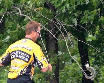 Once he was inside the bay on tournament day, he had a host of other tournament competitors to deal with. Oftentimes he'd go down a bank that four other competitors had just fished. It takes great mental concentration to block that out, but it also takes an understanding of how the fish are changing from day to day. "One of the things that I actually did differently, something that helped me to get where I was in this tournament, was that I fished the pattern within the backwater," he says. "I didn't just say, 'Here's the backwater, let's just fish on down the bank.' I tried each day to adjust to wind, current, water clarity and boat traffic. "The fish one day swapped over and got on undercut banks," he explained. "We're only talking about a 6-inch variation in banks. It was crazy. I'd go behind people and just rip them on a spinnerbait. "You have to look at an area like that and read it each day, because each day it changes.