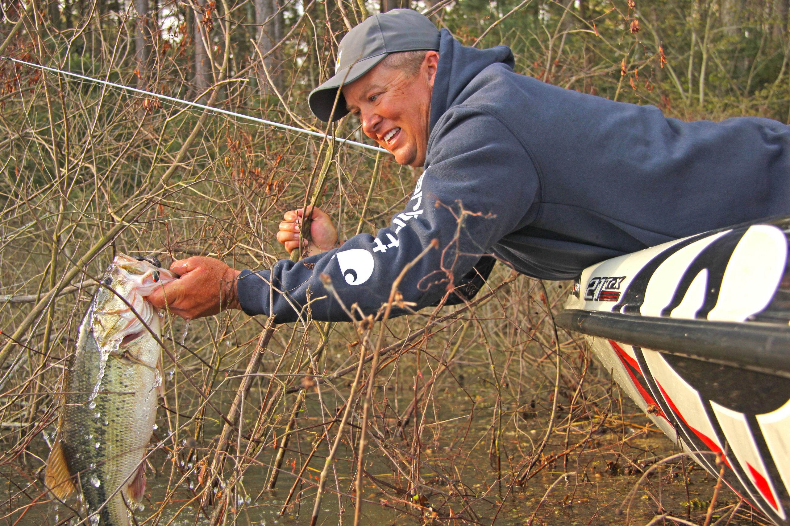 “Anytime you get high water in the spring, the flooded shoreline habitat is where you need to be headed,” says the Team Toyota pro and winner of nearly $2 million in tournament cash.