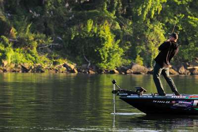 The shade and cooler water under grass mats attracts baitfish and bass better than other types of cover. Mixed cover such as a stump, large rock or laydown engulfed by grass tends to hold more quality fish during the summer. “Big fish seem to be homesteaders and will take over a certain spot this time of year,” says Martens. The five-time BASS winner knows if he catches a 5-pounder from such a spot, he can release the fish, mark the spot with his GPS and come back three or four days later and catch that same fish. Targeting isolated wood cover rather than stands of timber works best for Martens during the sum