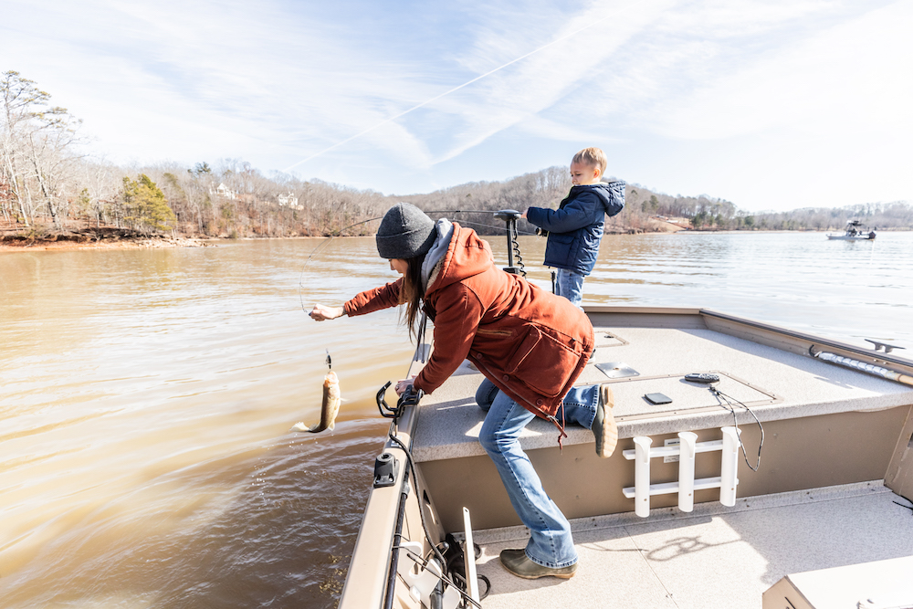 Mom helps boat the catch.