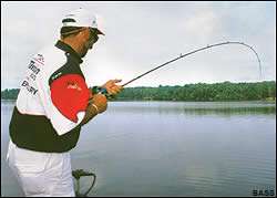 » 11:18 a.m. "Big fish!" Elias says excitedly as a bass puts a major-league bend in his cranking rod and rips drag. He fights the lunker for what seems like an eternity. When he finally gets the fish close enough to see, he drops to his knees, thumbs the reel as the fish dives under the boat, then slowly pulls it toward him until he can lip it. The hawg weighs 8 pounds, 1 ounce; it's the second-biggest bass any pro has landed in this series (Tim Horton's 9-2 is the biggest). "The plug ticked bottom one time, and she ate it," Elias says as he extracts the 20+ from its jaws. "What a beautiful fish!"
