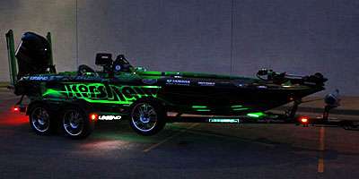 As in other years, the Bassmaster Elite Series pro’s wrap is an eye-catching green-on-black motif for title sponsor Kershaw Knives. But the latest edition goes one better: A light system makes the green accents appear to glow when the boat is on its trailer.