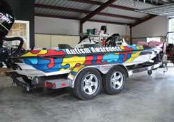 In late 2006, Delany wrapped his new Stroker boat powered by a 250XS Mercury in a colorful Autism Awareness ribbon. “Bassmaster Elite Tour wrapped boats gave me the idea,” he says.