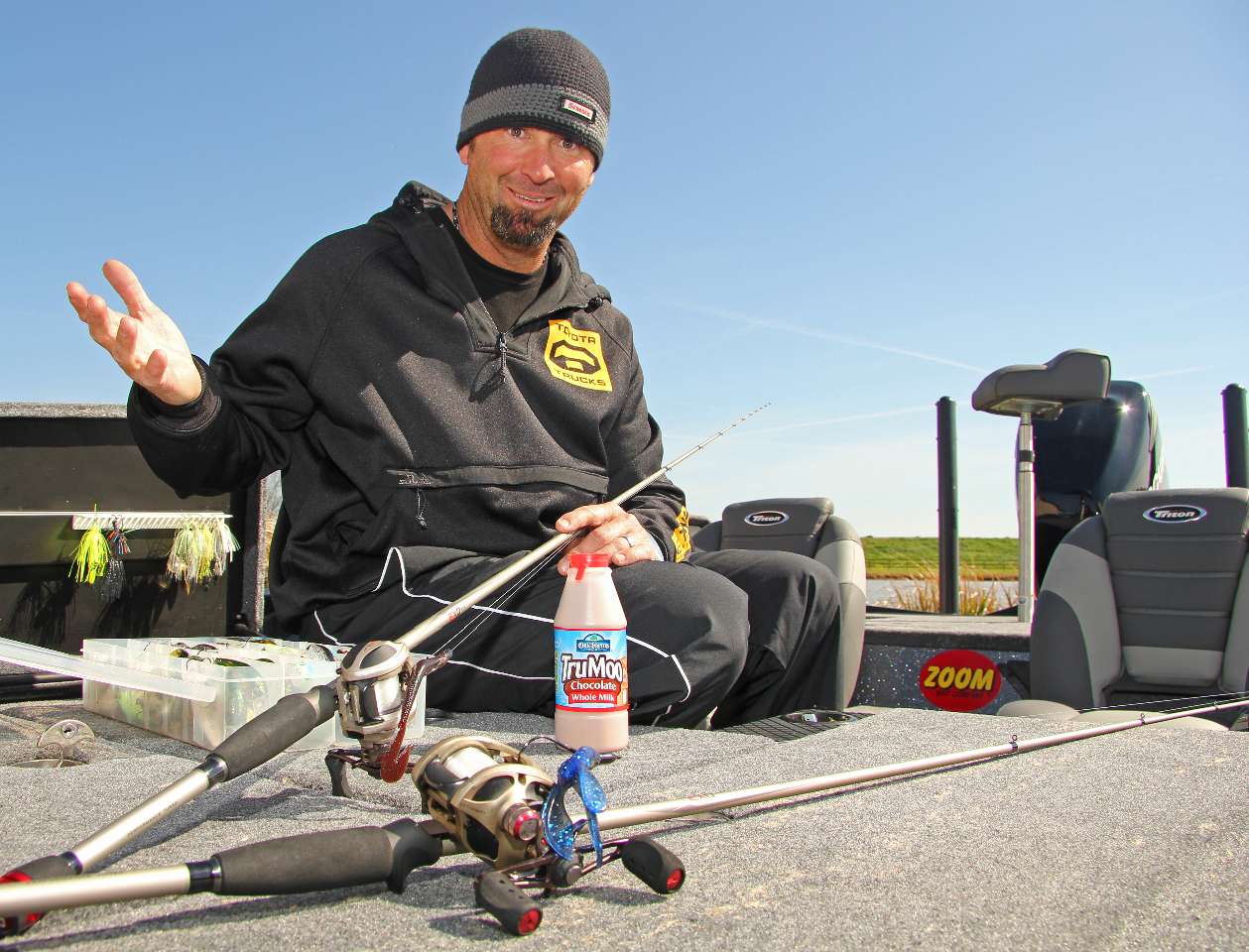 “When the water rises and gets off-colored, these bass are like me in a dark hotel room – they don’t move fast, and they don’t move far,” said Swindle, as he sat tying on shades of black, red and blue lures to a 6.6:1 gear ratio Quantum EXO reel, and 7-4 EXO pitchin’ stick.