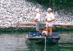 The grass stretched 15-20 yards offshore in places and contained a few stumps and fallen logs that had washed down in high water and anchored on the bottom.