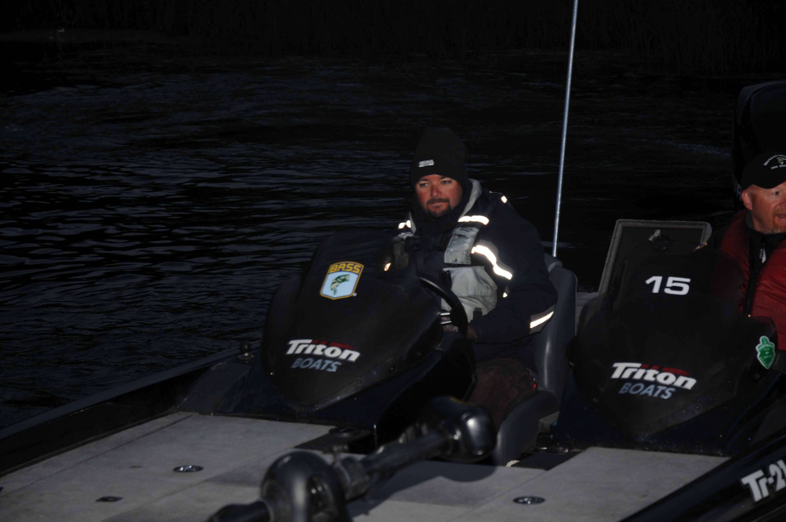 A cold front moved in last night dropping the temperatures into the 40's and prompting the competitors to dig out the coveralls, stocking caps and gloves for this morning’s take-off. Tournament leader Skip Sjobeck was bundled up for a cold ride and ready to make some adjustments for the changing weather conditions. “I just have to fish slowly like I did (yesterday). I marked a lot of fish with the graph that I could drop down on and catch, but then on some I would drop down (his drop shot rig) and they would swim away. They weren’t really feeding, but they did feed at times.” Today he plans on sticking with bottom-bouncing tactics with his drop shot rig and Carolina-rigged plastic lizard.