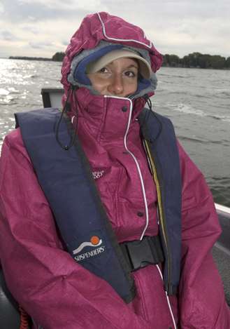 Before we went fishing, I put several layers of clothing on under my rain suit so I would stay warm on the water. It was cold. The wind was blowing and there were some pretty big waves on the lake.
