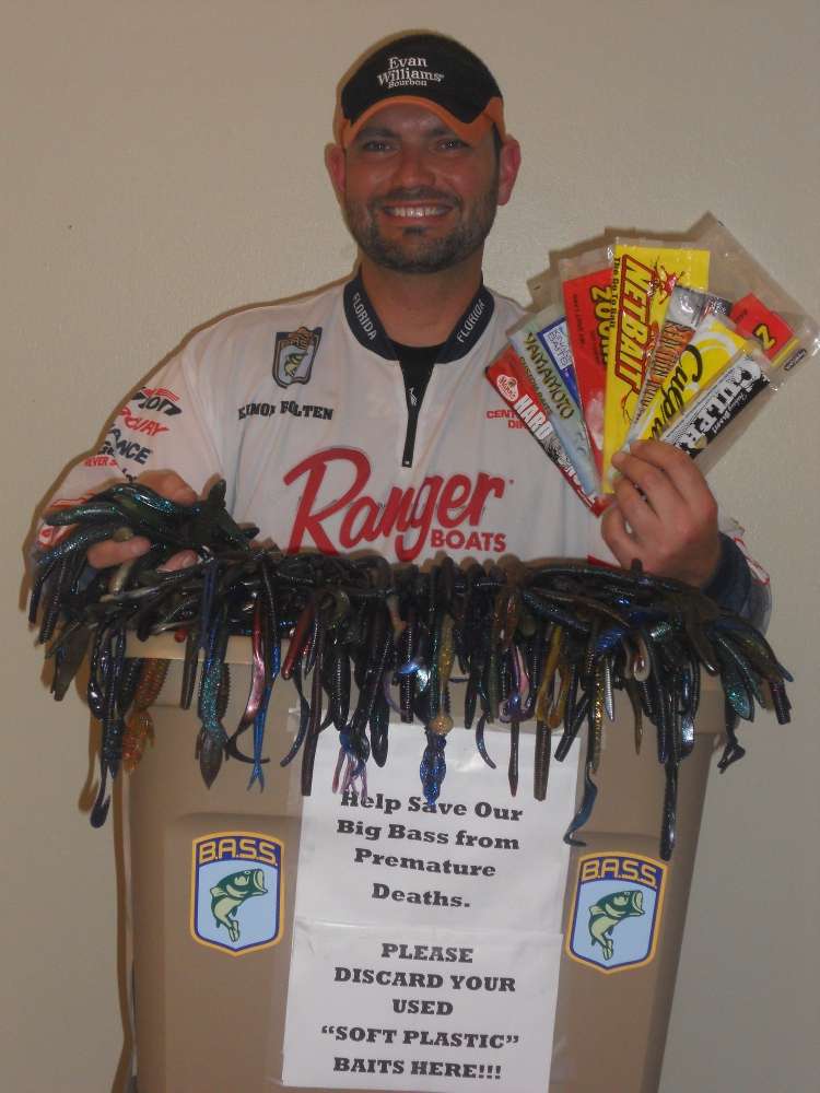 Before a recent state tournament on Lake Toho, Florida’s Eamon Bolten talked to 128 participants about problems caused by discarded soft plastics and asked them to deposit their used baits in a collection box.